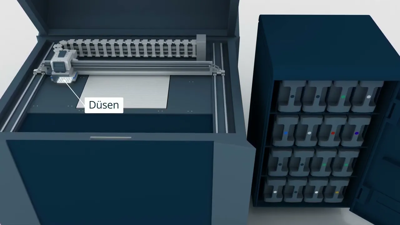 Da mehrere Druckdüsen vorhanden sind, können mehrere unterschiedliche Materialien gleichzeitig gedruckt werden. Ein Anwendungsbeispiel hierfür ist das Drucken von Stützstrukturen zeitgleich mit dem Druck des eigentlichen Teils. Andere Fertigungsverfahren, die zuerst die Stützstruktur und erst anschließend das eigentliche Material auftragen, benötigen dagegen deutlich mehr Zeit.