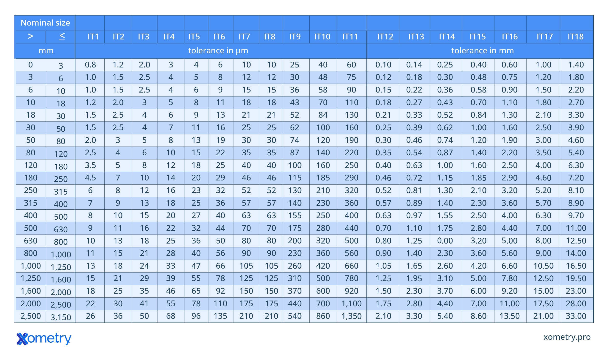 Folgen Sie nun dieser Zeile bis zum gewählten Internationalen Toleranzgrad (IT-Grad) ergibt sich aus der zugehörigen Spalte die Toleranzbreite. Für unser 40 mm durchmessendes Merkmal würde die Wahl des IT7 uns eine Gesamttoleranzbreite von 25 µm (oder 0,025 mm) ausgeben. Beachten Sie dabei, dass sich die Einheiten von Mikrometern (µm) zu Millimetern (mm) ändern, wenn Sie die gröberen IT-Grade erreichen (IT12 und höher).