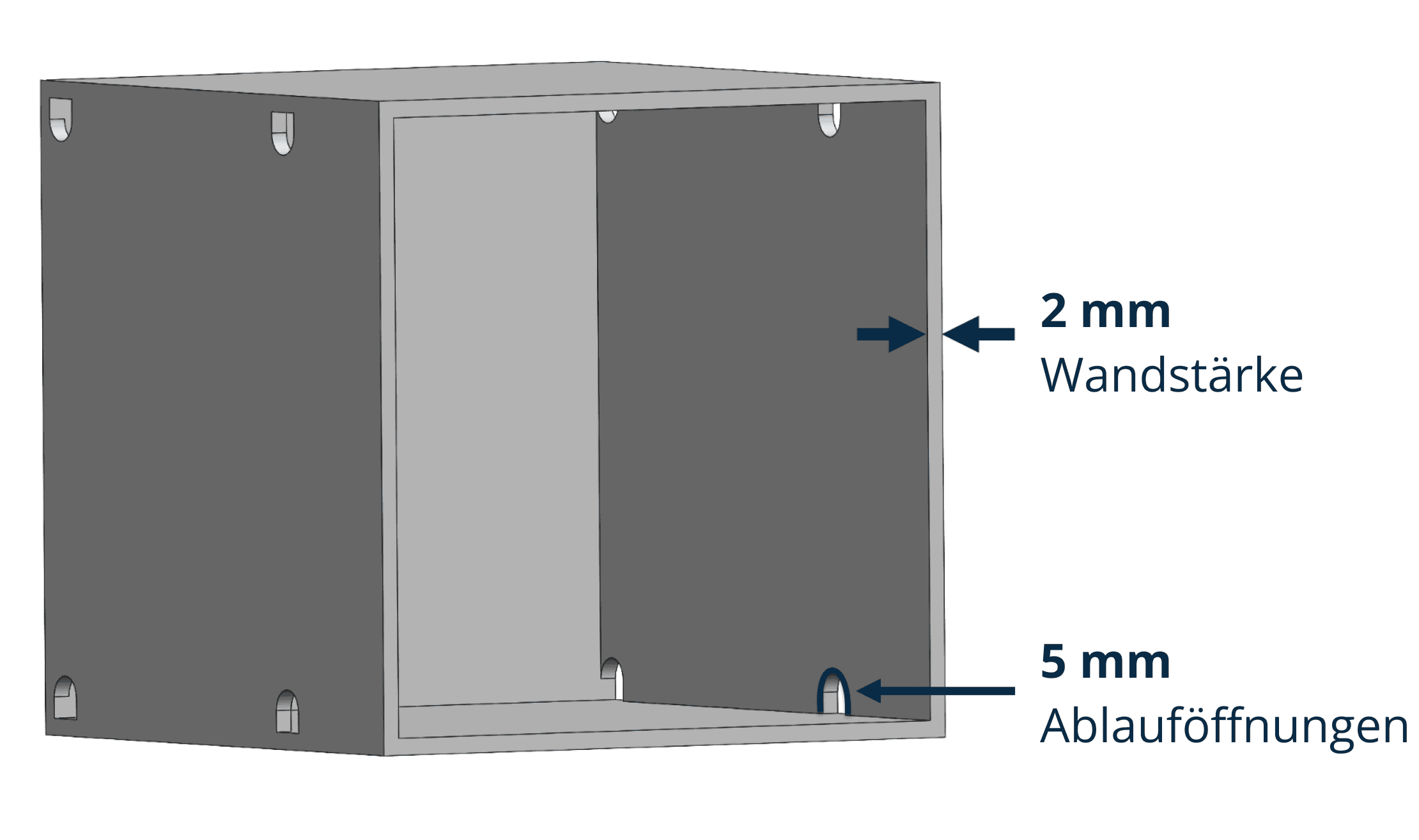 - Konstruieren Sie Wände mindestens 0,7 Millimeter dick für PA 12, und bis zu 2,0 Millimeter für steifere Materialien.