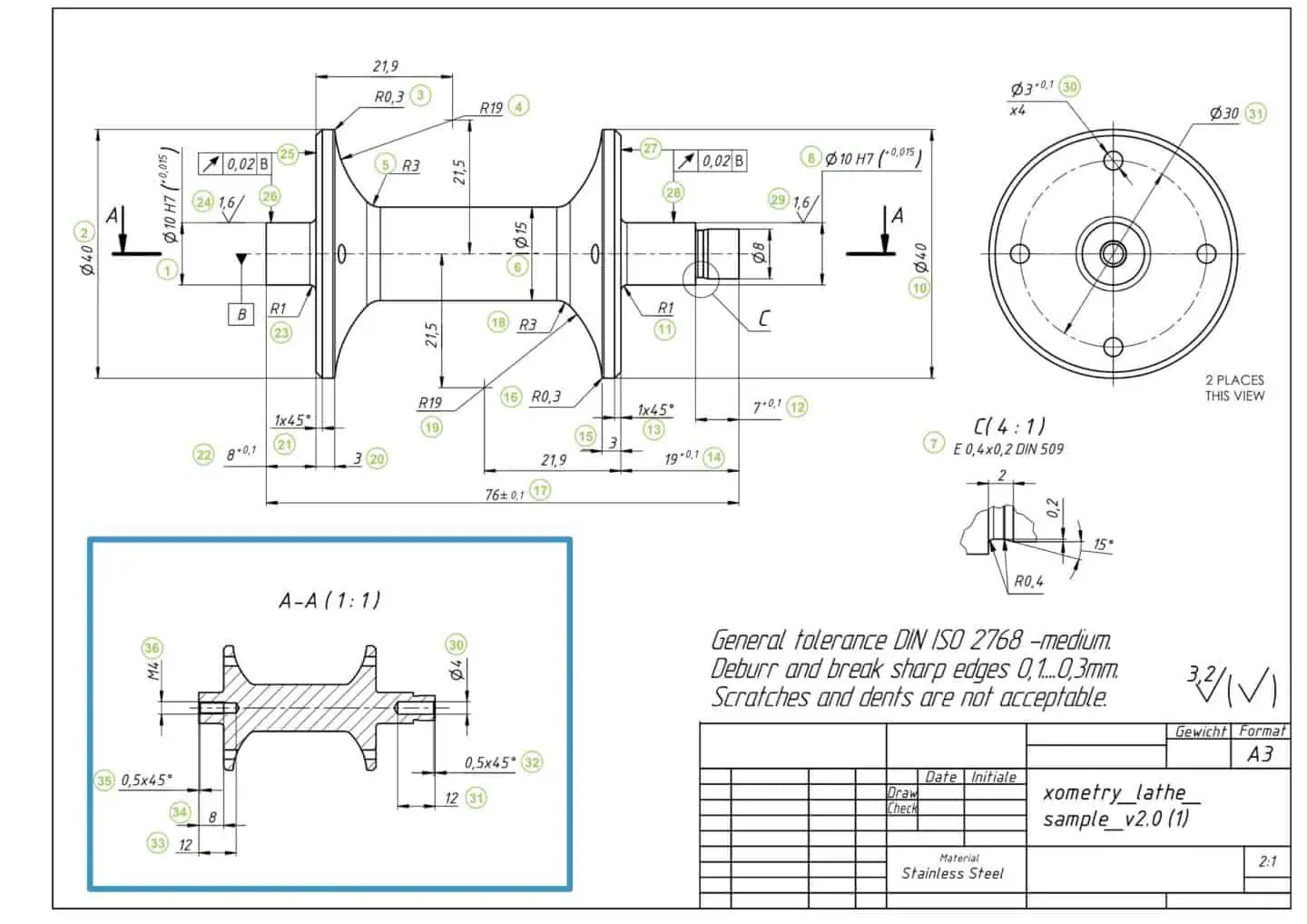 Außerdem liefern diese Dokumente eine eindeutige und unveränderliche Darstellung des zu fertigenden Teils. Sie dient dem Zerspanungsmechaniker zur Identifikation der Geometrie, der wichtigsten Maße, Funktionen und entscheidenden Merkmale. Technische Zeichnungen sind zwingend notwendig, wenn Ihr Teil Merkmale wie Gewinde, Toleranzen oder verschiedene Oberflächengüten in verschiedenen Bereichen enthält.