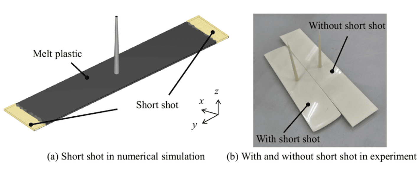 | Short Shots: Incomplete fill; missing or thin sections | Thin walls, sharp transitions, complex flow paths, low pressure | • Keep walls > 0.8 mm