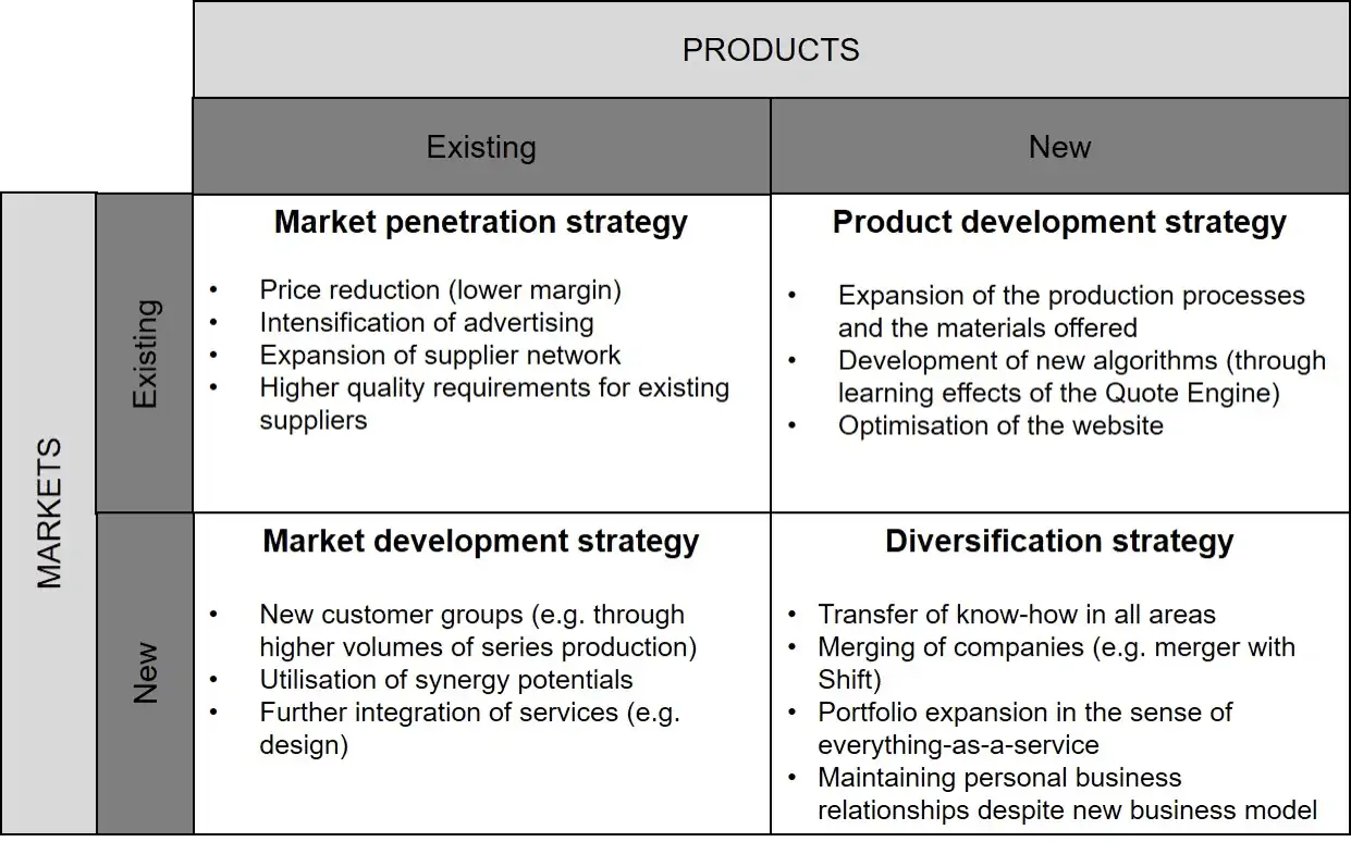 The Ansoff Matrix provides summarised information about the business growth strategies for a specific company (Xometry in this instance). The following figure (Fig. 3) is the result of my analysis.