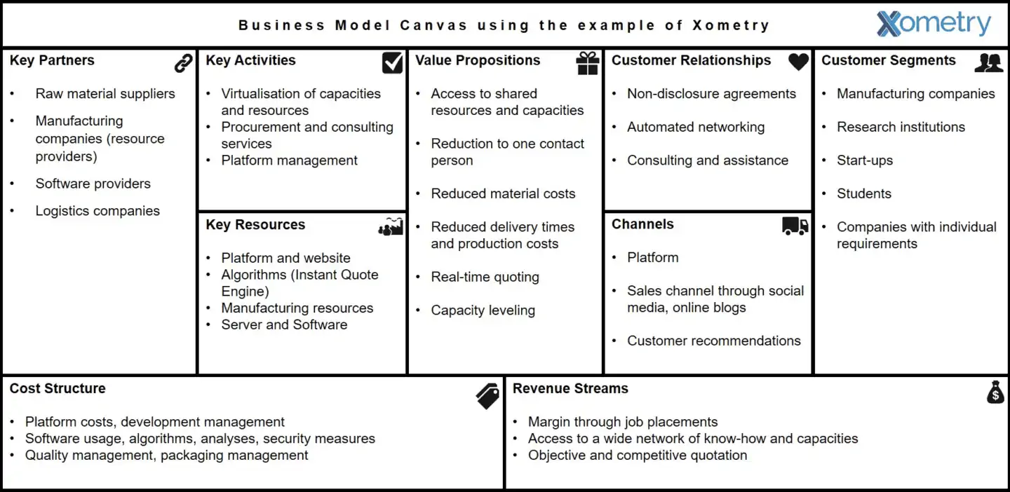 At this point, you should already have a reasonable understanding of the actual possible business impact of Xometry. Nevertheless, to be even more precise, I will now use the Business Model Canvas in the following figure to further illustrate Xometry’s market role: