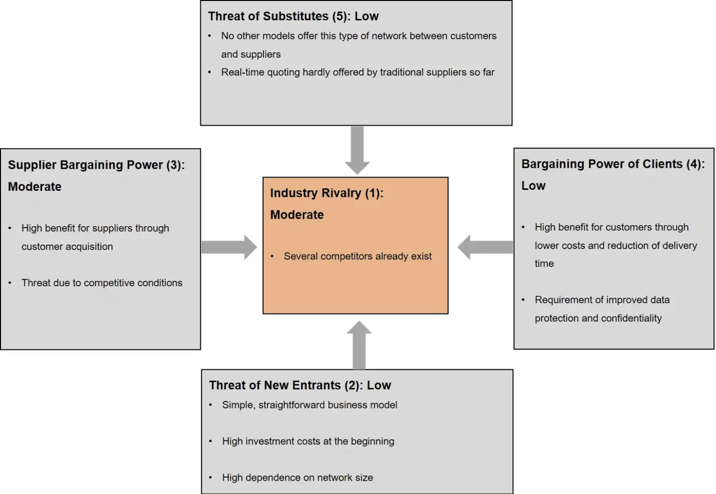 The tool consists of five fields, namely the threats of new entrants (2), the bargaining power of suppliers (3), the threat of substitutes (5), the bargaining power of buyers (4), and the industry rivalry (1).