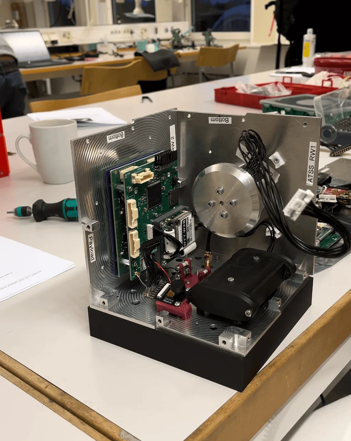 Integration of the reaction wheel system onto CNC-machined aluminium plates, manufactured with precision for optimal performance in microgravity conditions.©