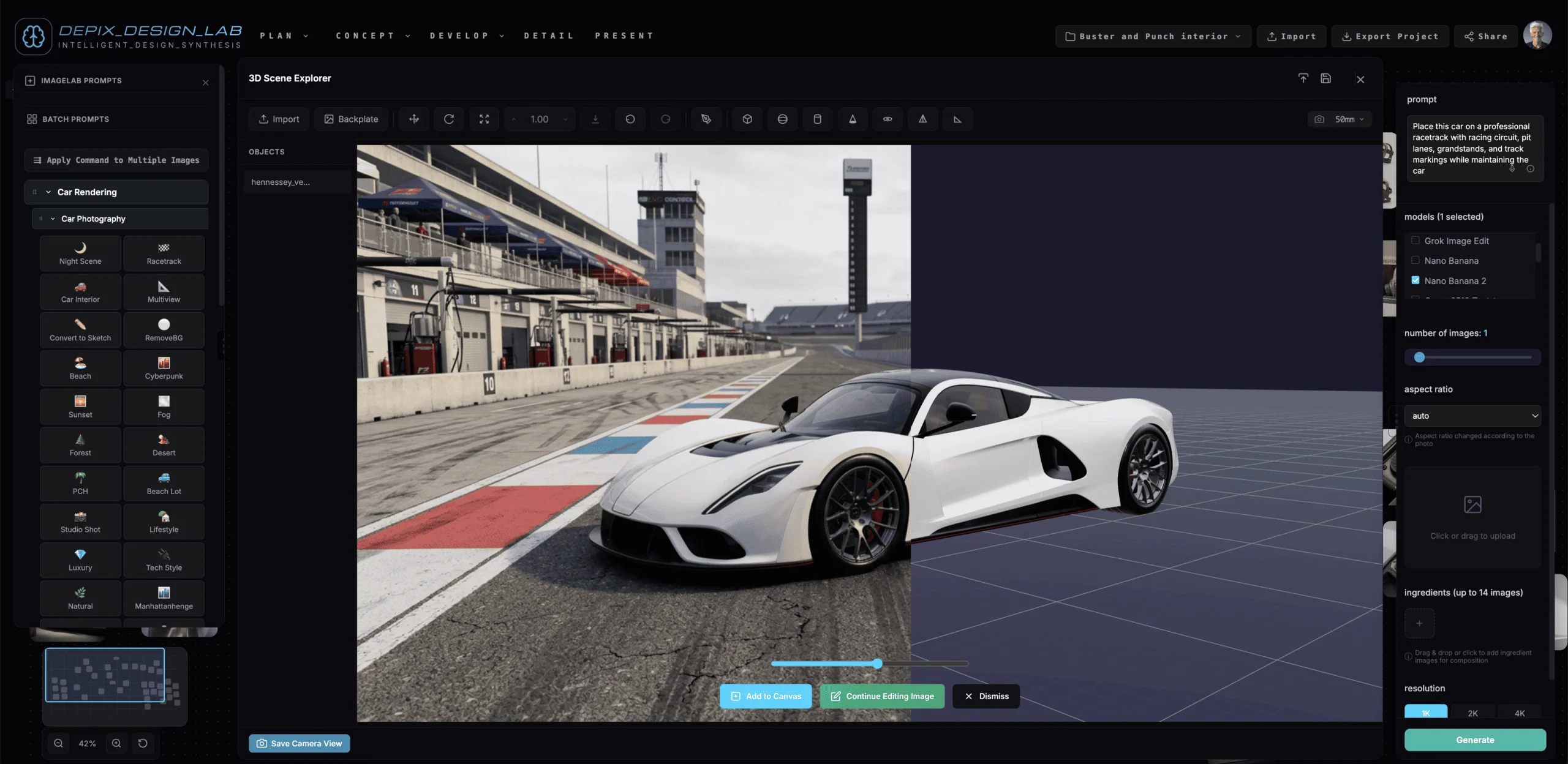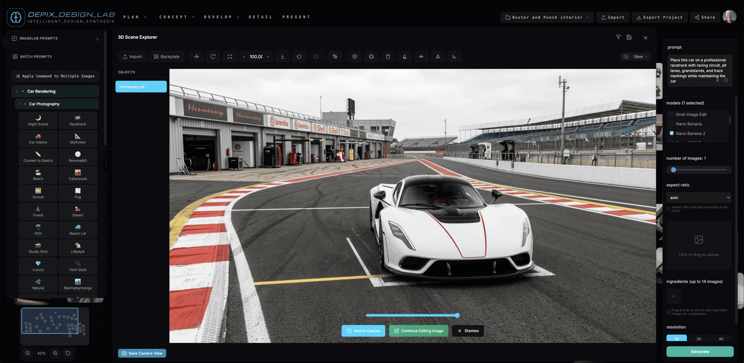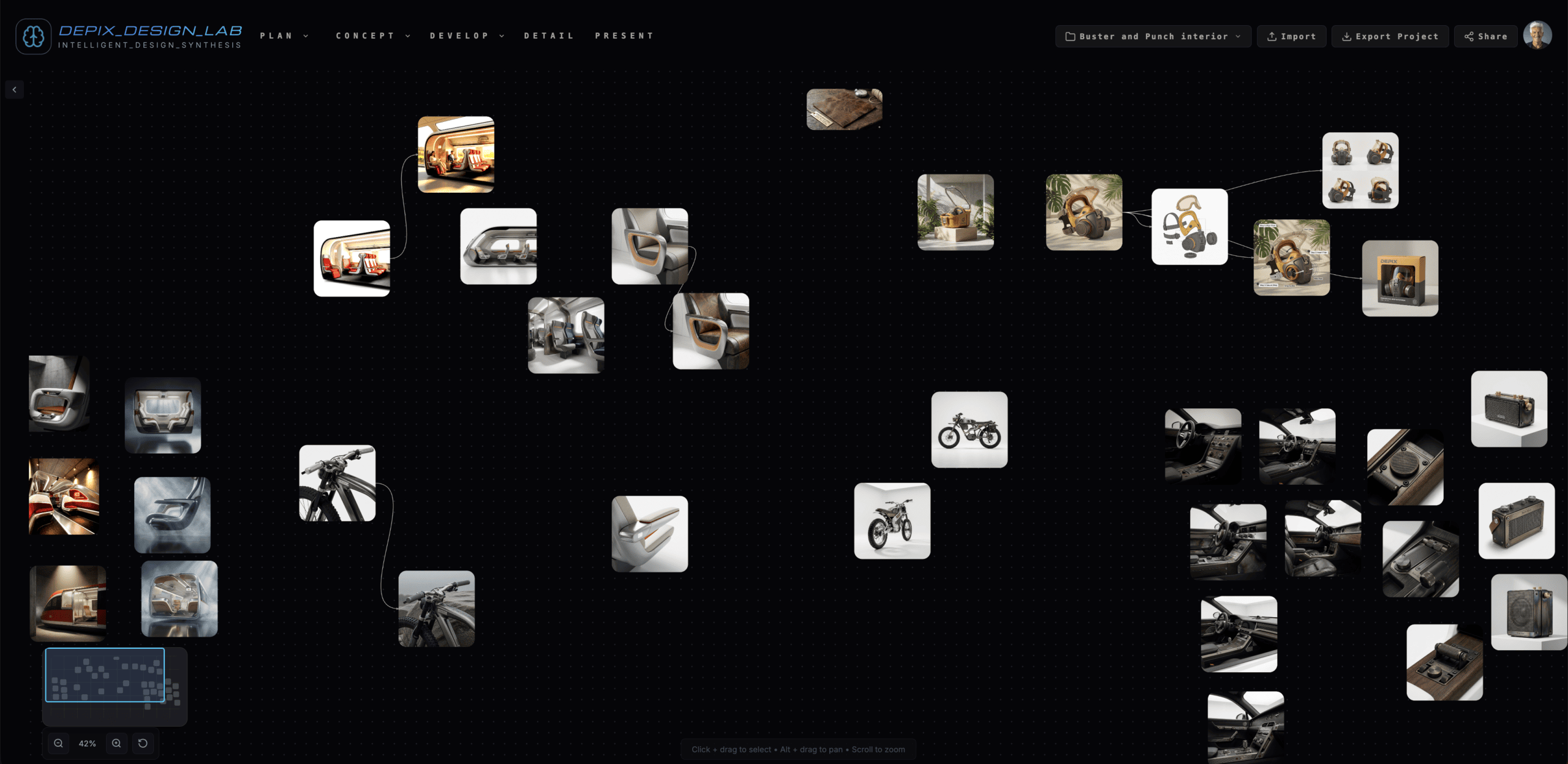 Design Lab is the orchestration layer. It’s an infinite canvas where you bring images in, work with hundreds of preset prompts for generating variations, and launch different agents from there. You can bring in a 3D model and visualise it like you would in a traditional package, but everything uses generative AI instead of ray tracing.