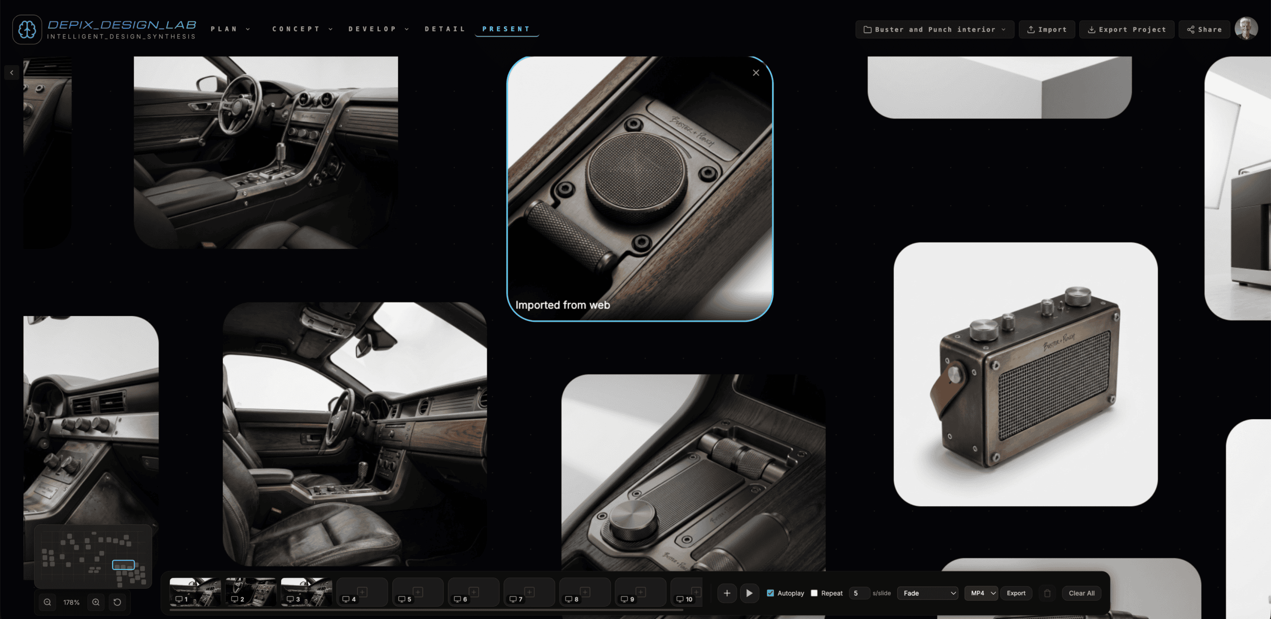 Then there’s the CMF tool for colour, materials and finishes. You put in your product, it searches the market for current colour trends, synthesises them and generates materials and finishes that you can apply to your image. It compresses weeks of CMF work into minutes.