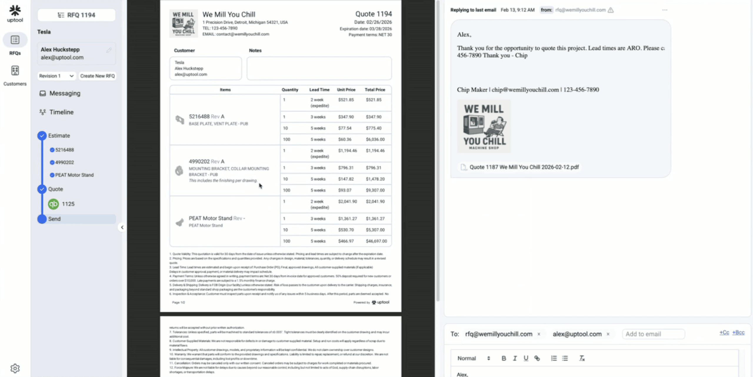 Every customer has a central dashboard that is essentially a command center. It integrates with email and populates automatically. Shops can triage and prioritize RFQs and see their full history. In the background, we’re building an automatic CRM that matches RFQs to the right contact and company, so they can track ordering patterns and win rates without maintaining anything manually.