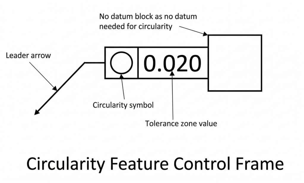 - No Zone Symbol: Because circularity uses the default 2D tolerance zone, no specific zone shape symbol (like a diameter symbol) is required in this block.