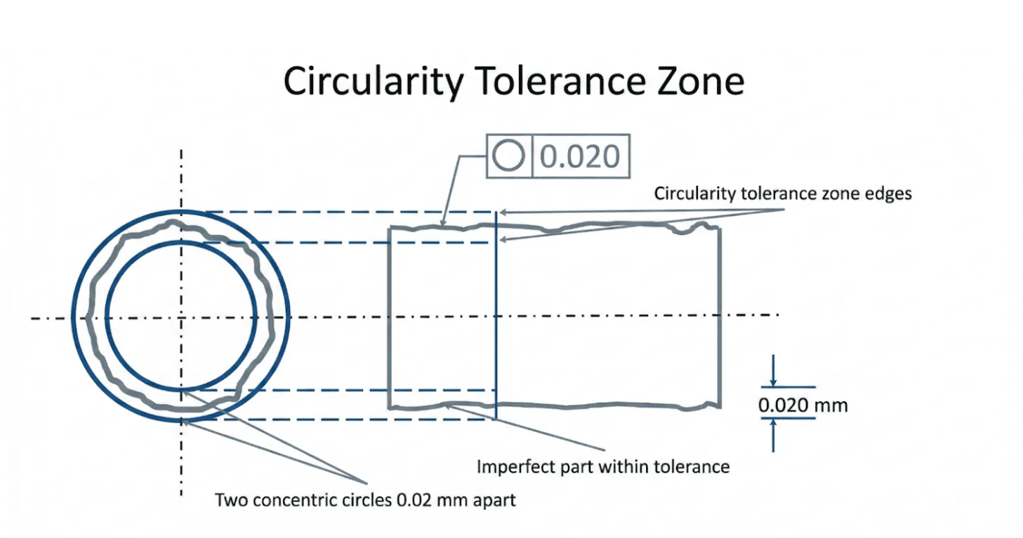 Note: As a practical rule, circularity should typically be equal to or tighter than the feature’s size tolerance; otherwise it may be redundant and add inspection cost without improving function.