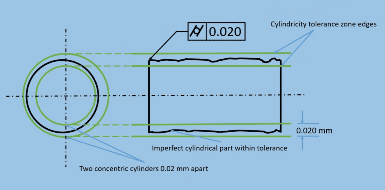 Think of a cylinder as a stack of coins. By defining a cylindrical tolerance zone, the control ensures two things: