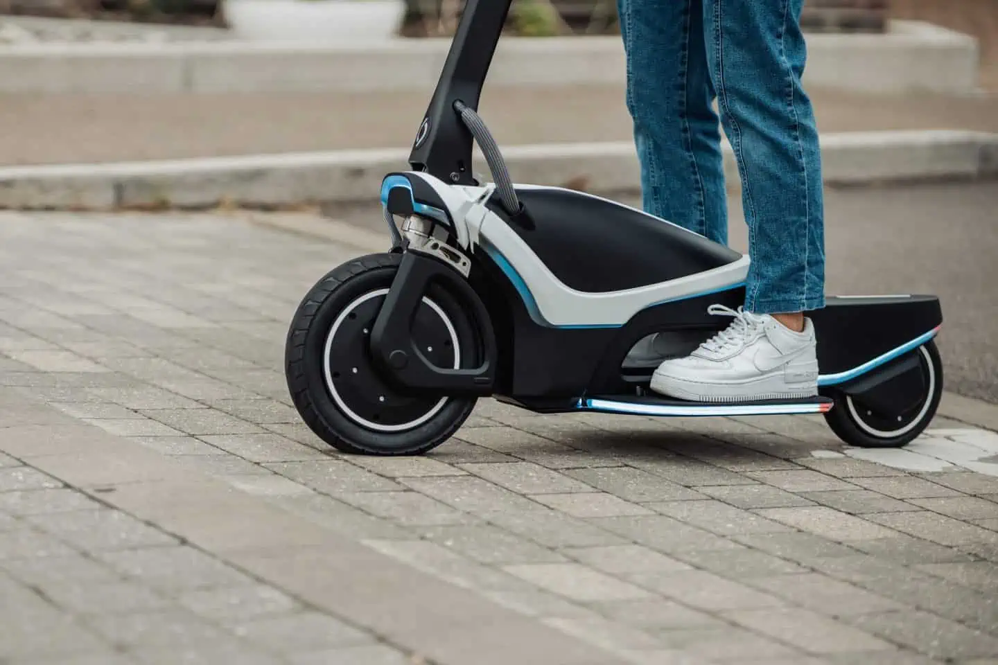 This e-scooter features both active and passive safety elements, from the full-perimeter illumination system that provides high visibility when riding, to the large front wheel that helps with road pot-holes and even the ride position, where riders stand with their feet facing forward, straddling the middle of the e-scooter.