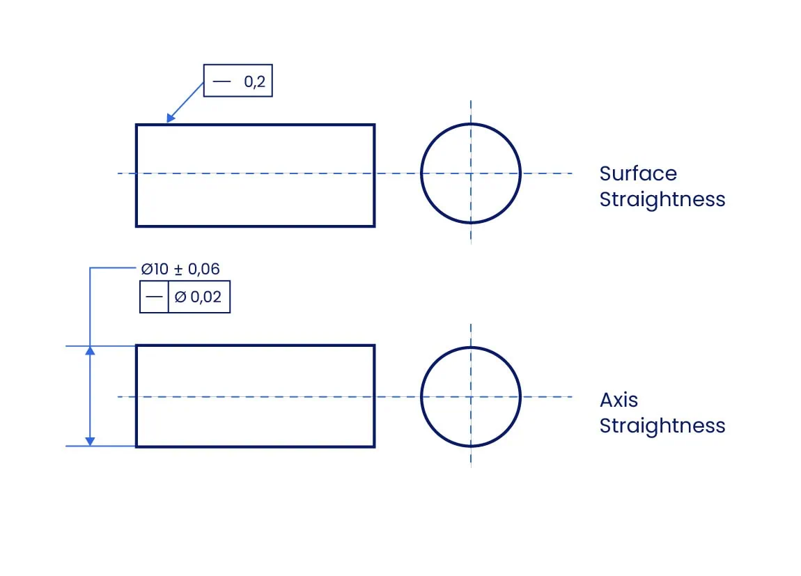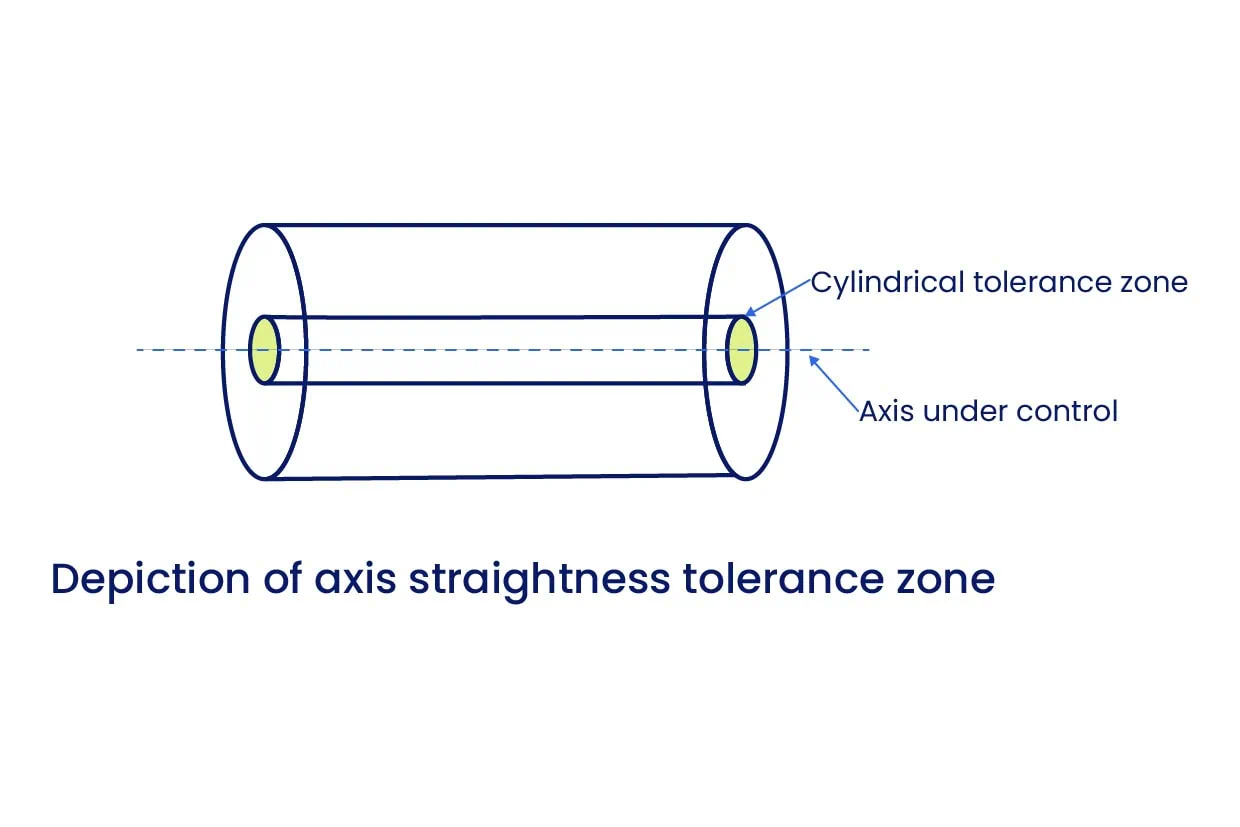 Cuando se aplica a una «característica de tamaño», como el diámetro de un eje, un pasador o un orificio, la cota controla la rectitud del eje central de la característica, no la superficie en sí.