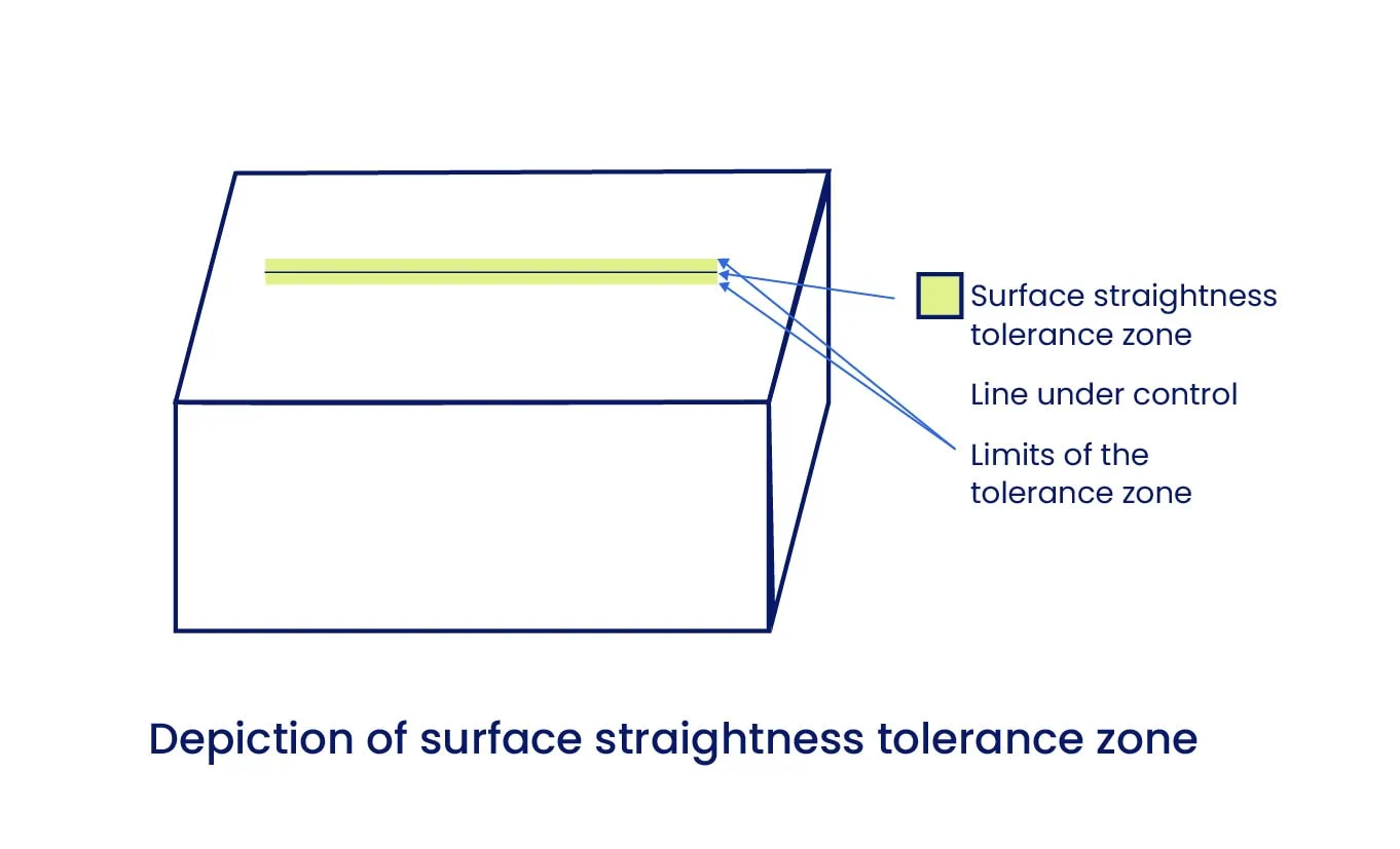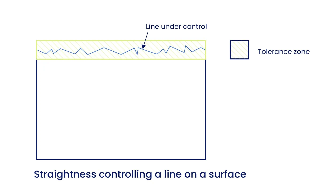Cuando se aplica a una superficie, la referencia de rectitud controla la linealidad de los elementos de línea individuales en esa superficie. No controla toda la superficie a la vez (eso sería la planitud).