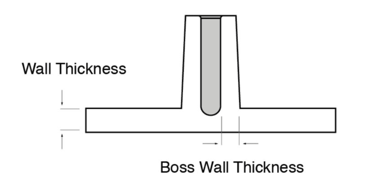 | Épaisseur de paroi pour les bossages | Pas plus de 60 % de l’épaisseur de la paroi |