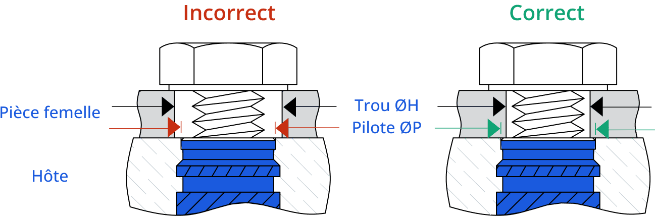 Le diamètre du trou de dégagement dans la pièce femelle est également important. C’est l’insert, et non le plastique, qui doit supporter la charge. Le trou dans la pièce femelle doit être plus grand que le diamètre extérieur de la vis d’assemblage, mais plus petit que le diamètre de guidage ou de la face de l’insert. Cela empêche l’arrachement de l’insert.