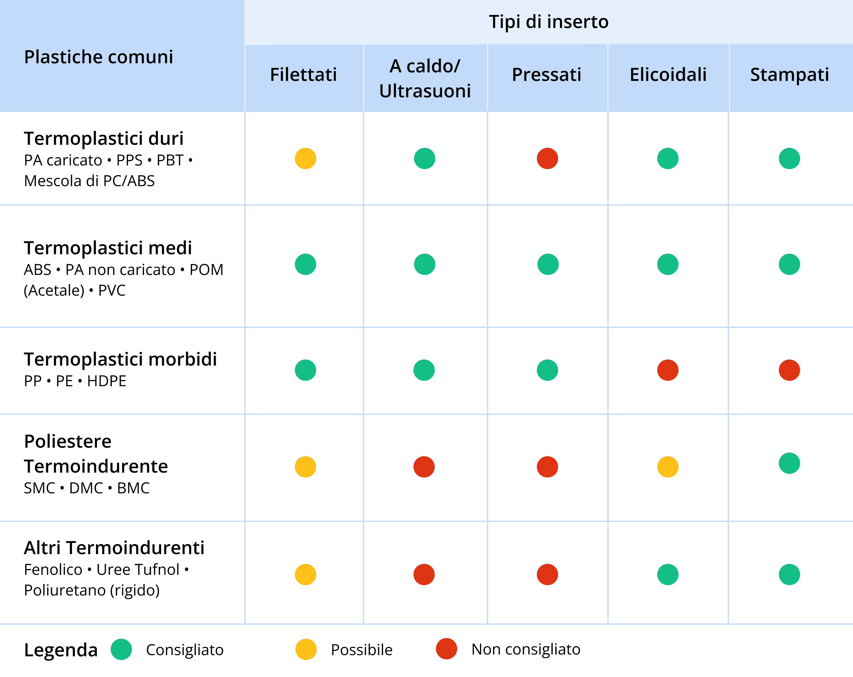 Sul mercato sono disponibili diversi tipi di inserti standard. Quelli più comunemente utilizzati sono gli inserti a pressione, gli inserti di maschiatura, gli inserti termofissati, gli inserti elicoidali, gli inserti a stampo e quelli con spina di centraggio