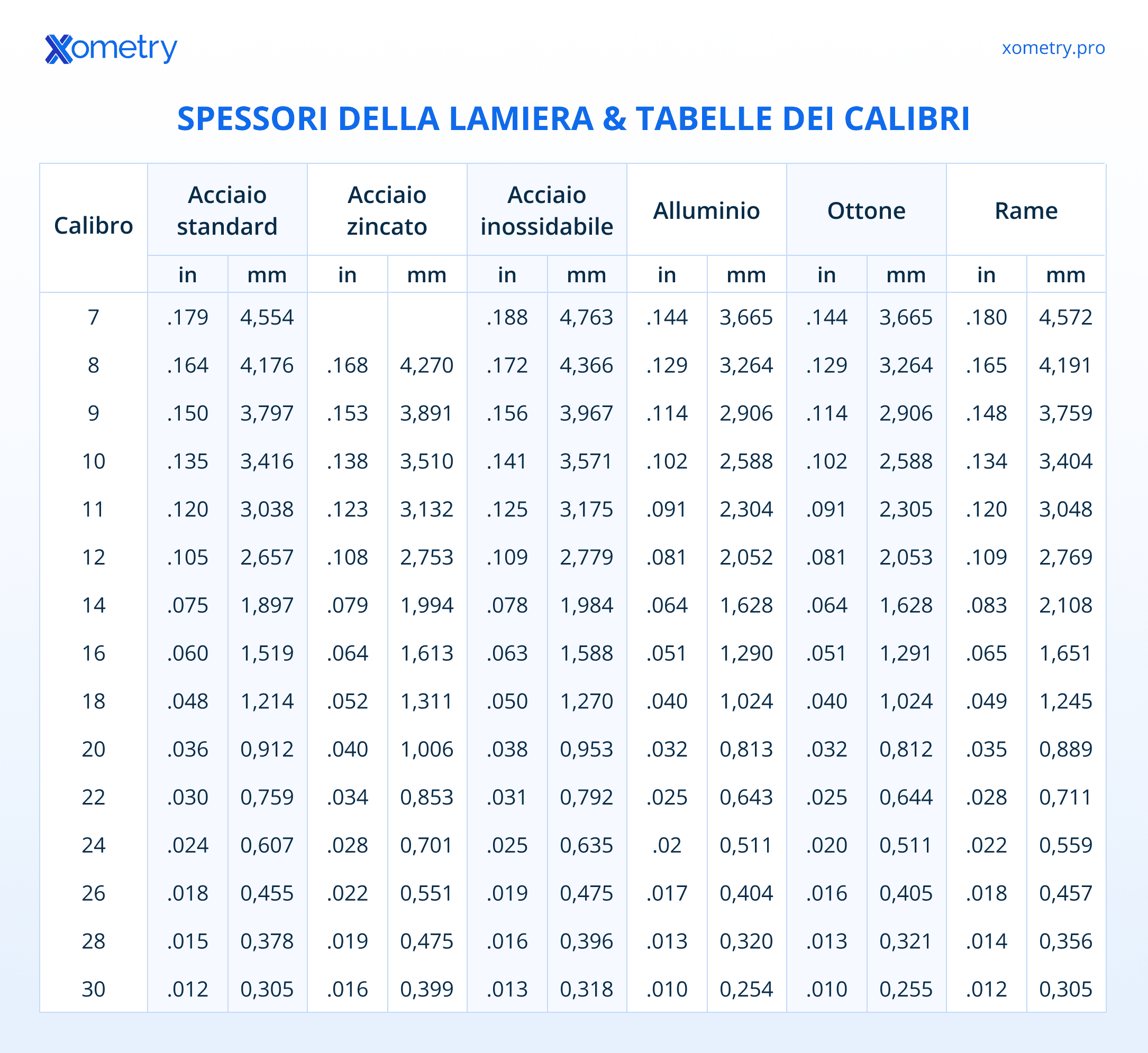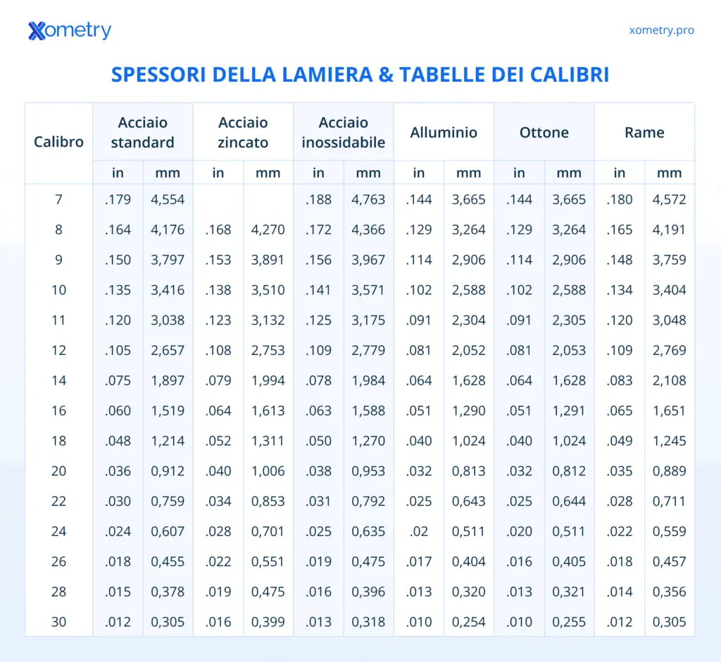 La sezione seguente presenta le tabelle dei calibri dei materiali più usati per la lavorazione della lamiera.