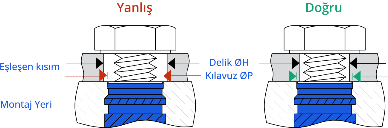 Eşleşen bileşendeki boşluklu deliğin çapı da önemlidir. Yükü plastik değil, insert taşımalıdır. Eşleşen bileşendeki delik, montaj vidasının dış çapından daha büyük ancak insertin kılavuz delik çapından veya ön çapından daha küçük olmalıdır. Bu sayede insertin dışarı çıkması (jack-out) önlenir.